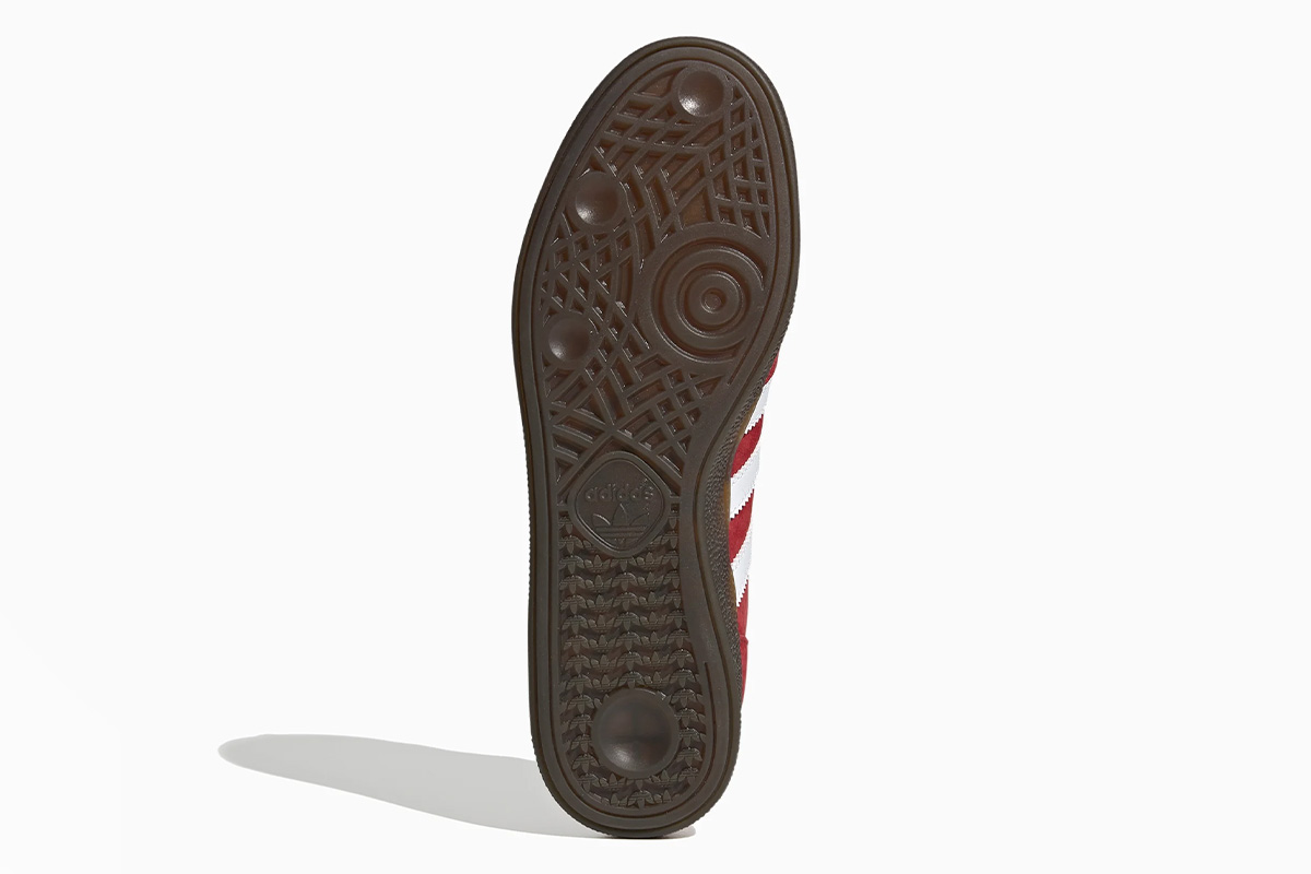Inspired by indoor sports, the adidas Handball Spezial Scarlet Gum is a retro-inspired sneaker from the adidas Handball lineup in a “Spezial Scarlet Gum” colorway. This adidas Handball Spezial sneaker features a Scarlet Red soft suede upper with contrasting hits of white on the jagged edge three stripes branding, branded tongue tag, and heel collar panel. Metallic Gold accents on the “SPEZIAL” Trefoil branding on the lateral next to the three stripes and the adidas branding on the tongue tag add more contrasting hues to the upper. The iconic T-toe overlay appears on the toe and forefoot. A white branded insole, Scarlet Red round laces, and a Gum sole unit round out the design.