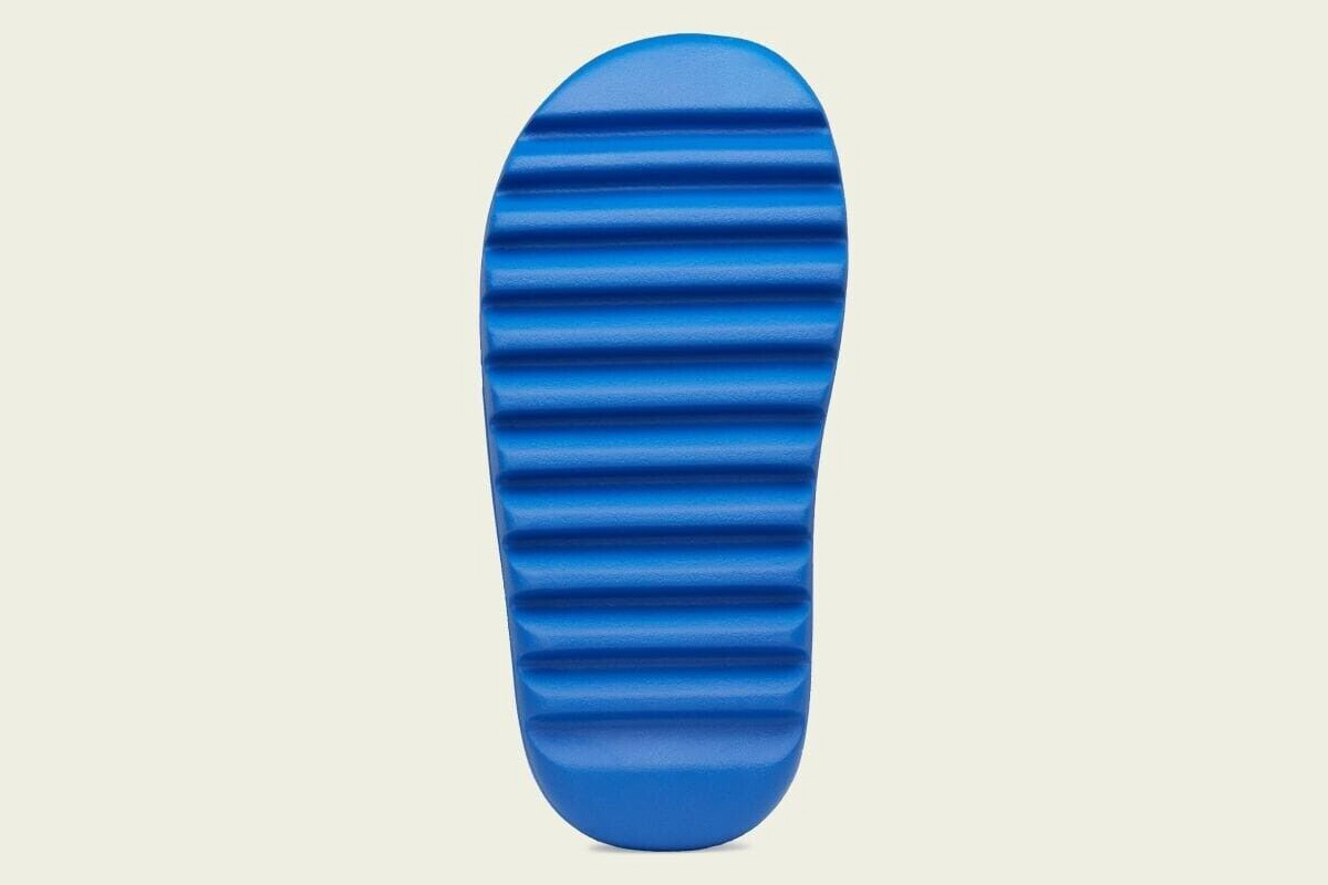 The adidas Yeezy Slide ‘Azure’ showcases a vibrant blue finish on the futuristic comfort sandal, featuring a minimalist one-piece build made with injected EVA foam.