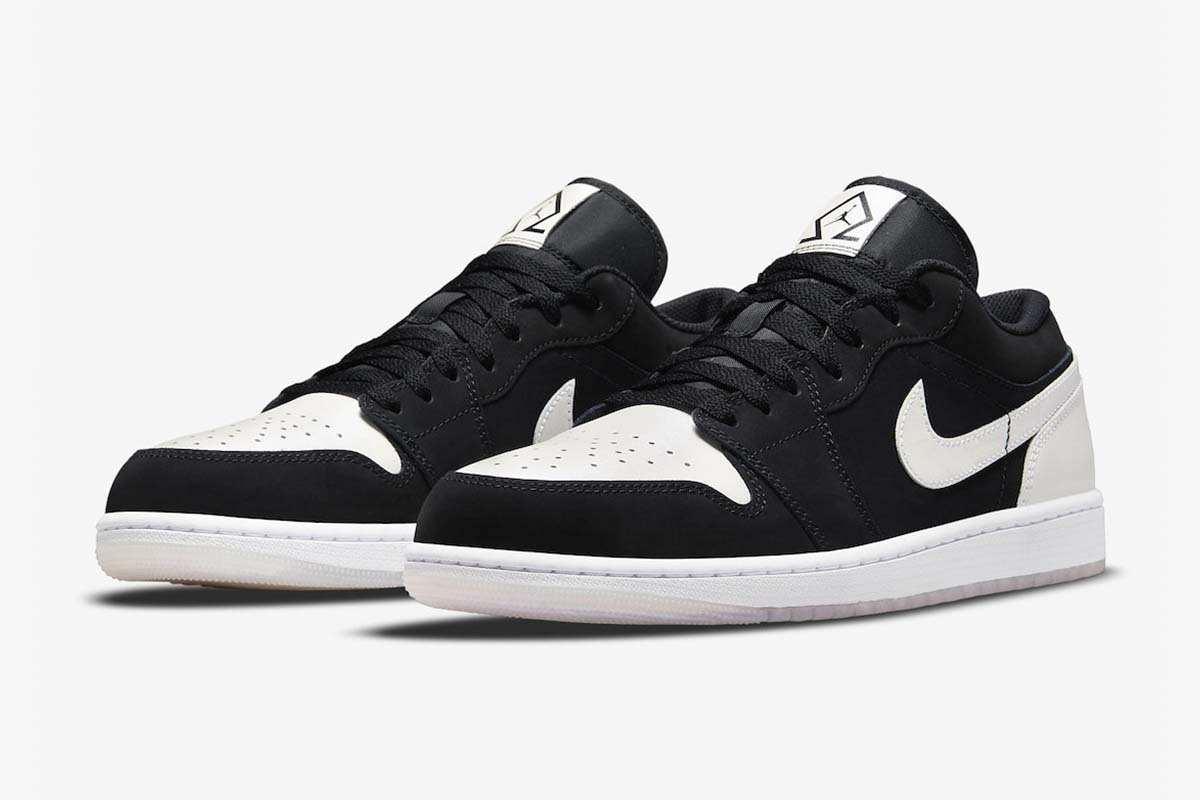 The Jordan 1 Low Diamond Shorts features a black Durabuck and white leather upper in a classic color blocked format, similar to legendary Jordan 1s like the Bred and Shadow colorways.