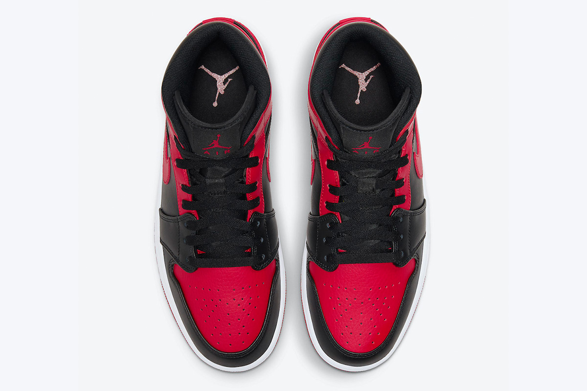 The Air Jordan 1 Mid ‘Banned’ showcases a familiar palette that recalls the iconic Black/Red AJ1 from 1985, inaccurately mythologized as the shoe that earned Michael Jordan a $5,000 fine every time the rookie wore the two-tone colorway during NBA games.