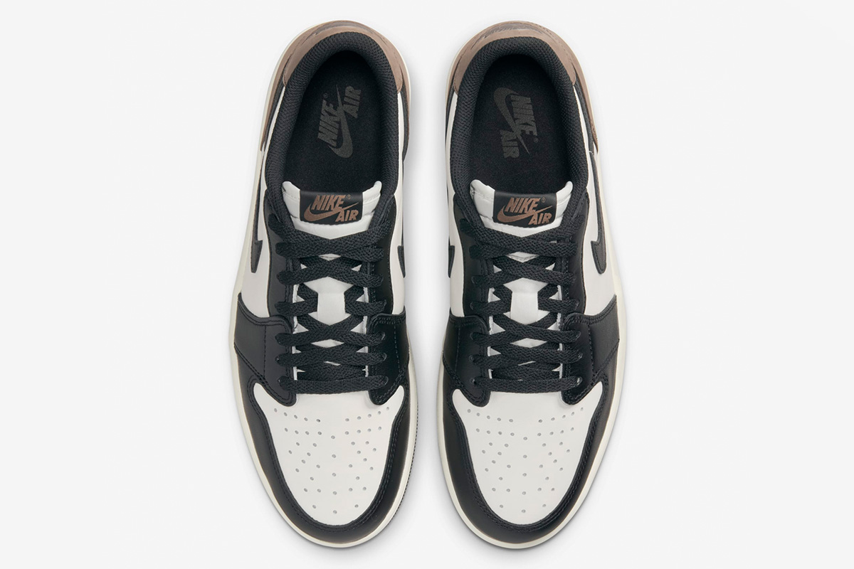 The Air Jordan 1 Retro Low OG ‘Mocha’ features a white leather upper with contrasting black accents on the forefoot overlay and Swoosh. Brown nubuck wraps the heel overlay and back tab, marked with a Wings logo in black. Nike Air branding embellishes the woven tongue tag and sockliner. A subtle off-white finish coats the midsole, fitted with encapsulated Air-sole cushioning and supported by a black rubber outsole.