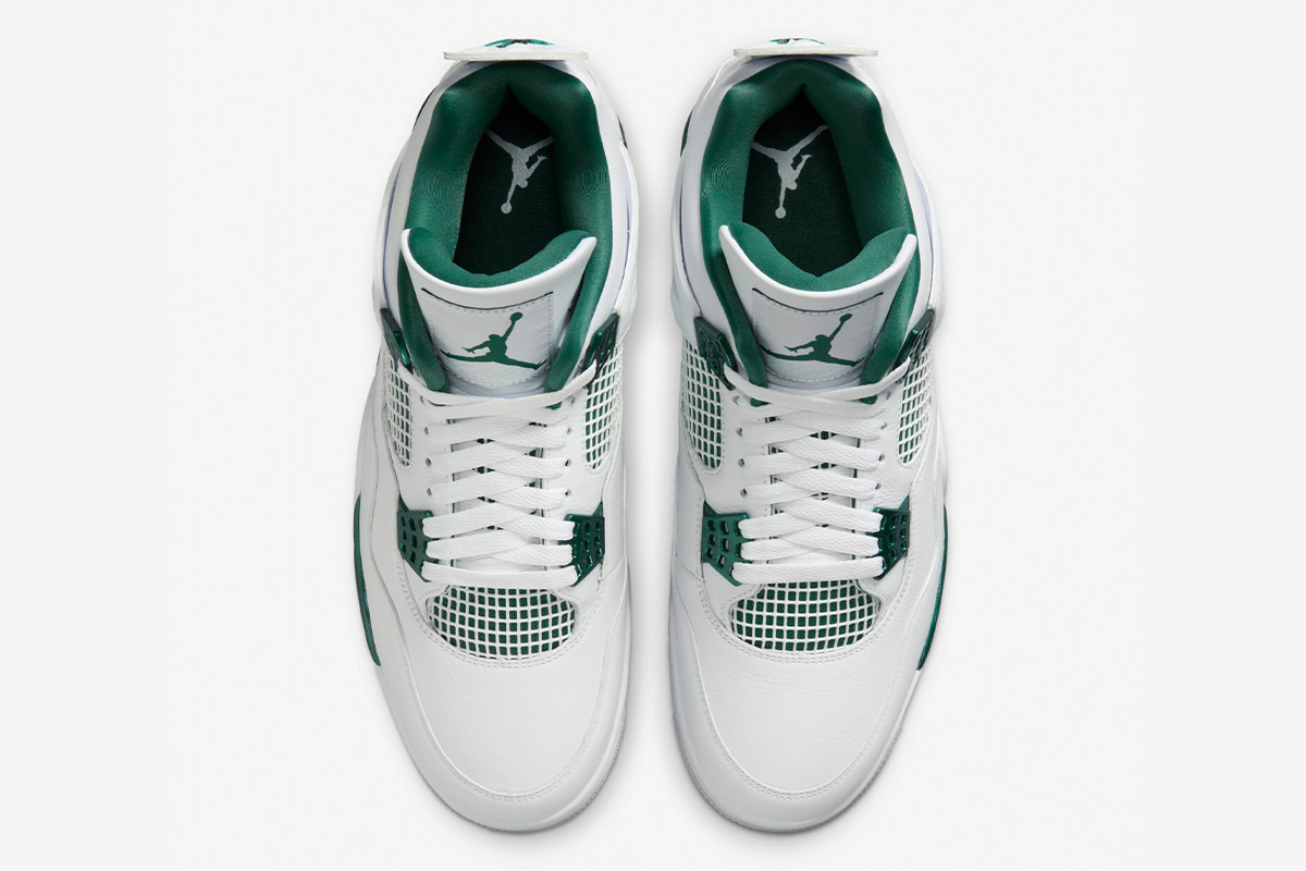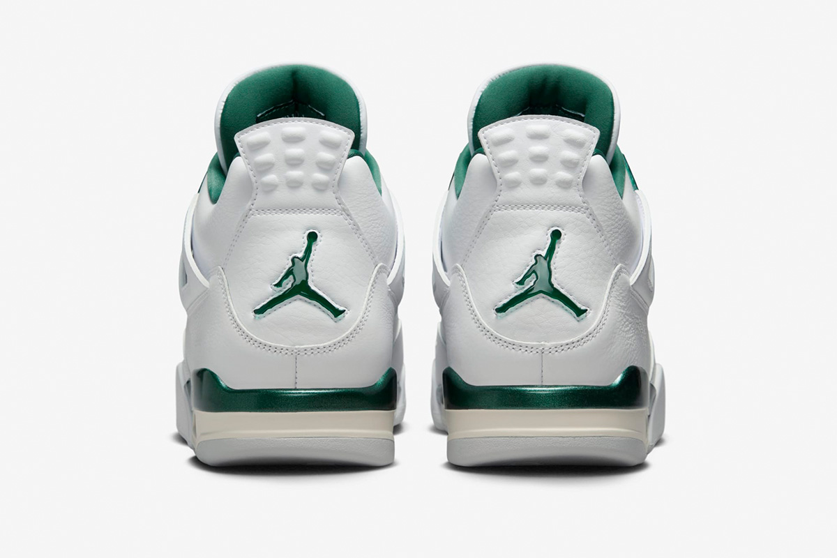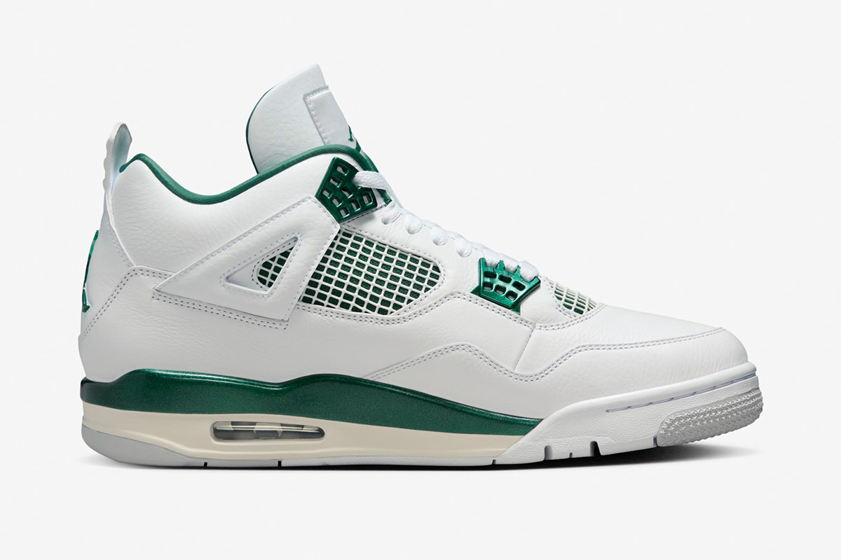 The use of crisp White and deep Oxidized Green on the upper gives the sneaker a retro, varsity-sports-inspired appearance. The base is constructed from smooth leather in White with tonal leather overlay panels and wavy rows of tonal stitching. Oxidized Green details can be found on the floating, web-like eyestays, the synthetic collar lining, the sockliner, the Jumpman logo on the tongue’s tag, the Jumpman on the heel, and a strip on the midsole. Like other Jordan 4 Retro models, this version features visible air units in the heel that cushion the foot.