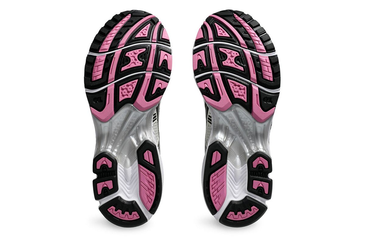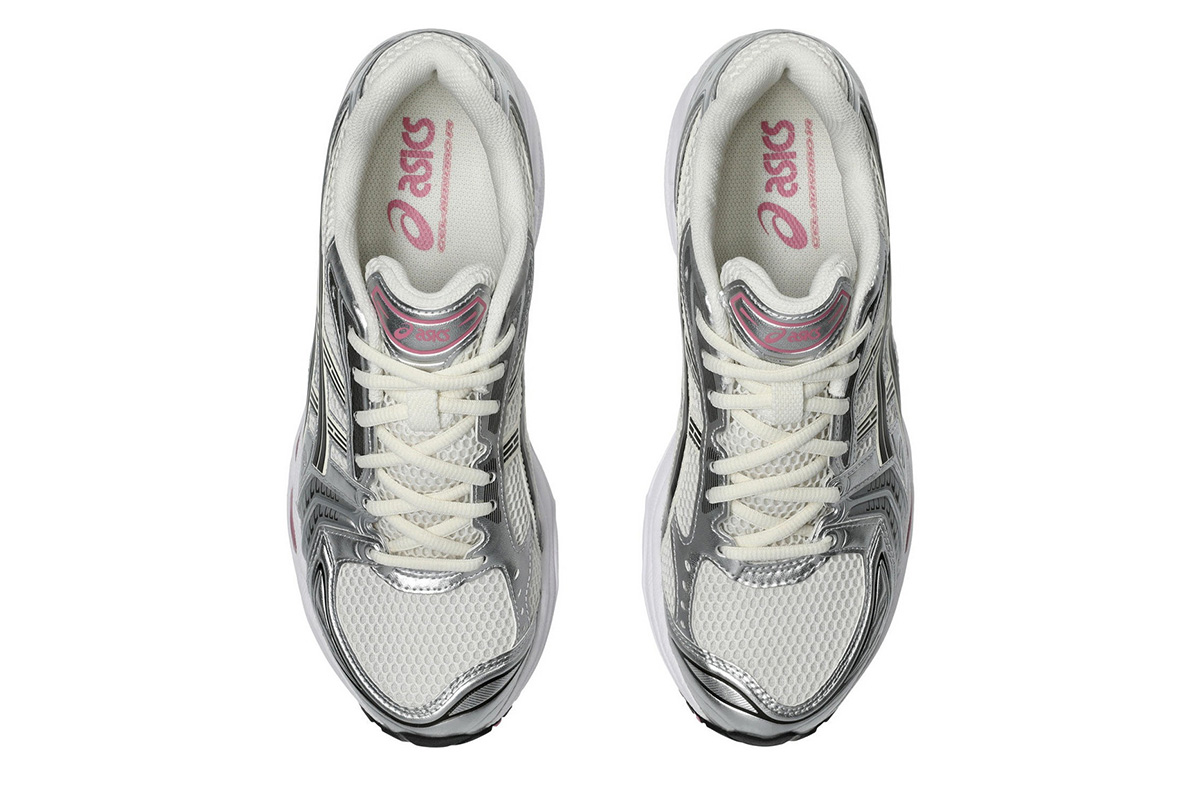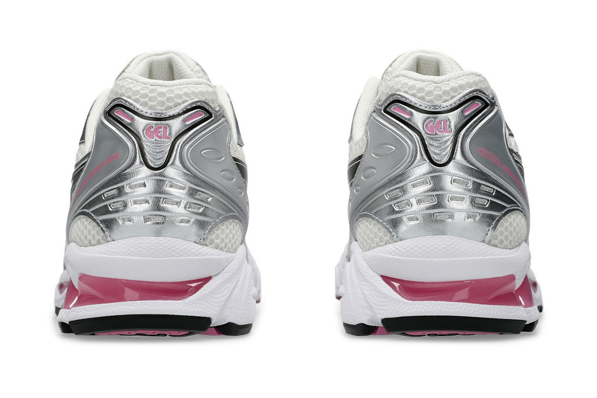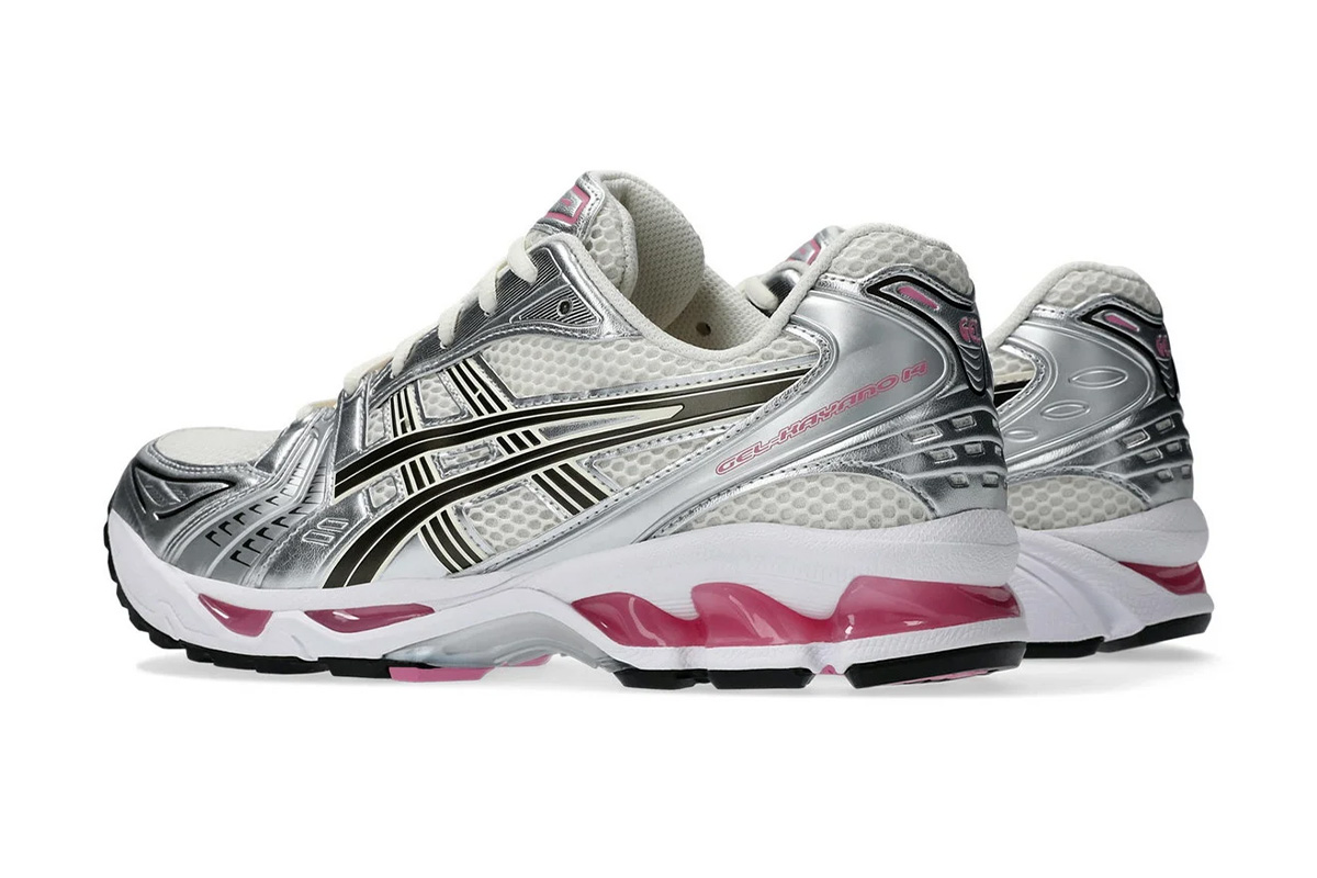 The ASICS Gel Kayano 14 ‘Cream Sweet Pink’ dons an open-cell off-white mesh upper with shiny synthetic leather overlays in metallic silver. Heavy black lines trace the arcing contours of the signature side stripes, while contrasting pink accents highlight the branding elements that adorn the tongue and heel overlay. Anchoring the retro runner is a white foam midsole with visible Gel cushioning tinged in a hot pink hue. Underfoot, the rubber outsole features flex grooves and an exposed TPU shank.