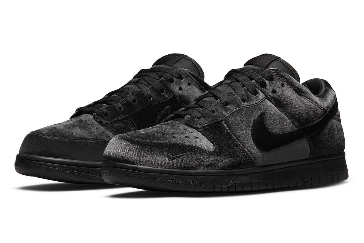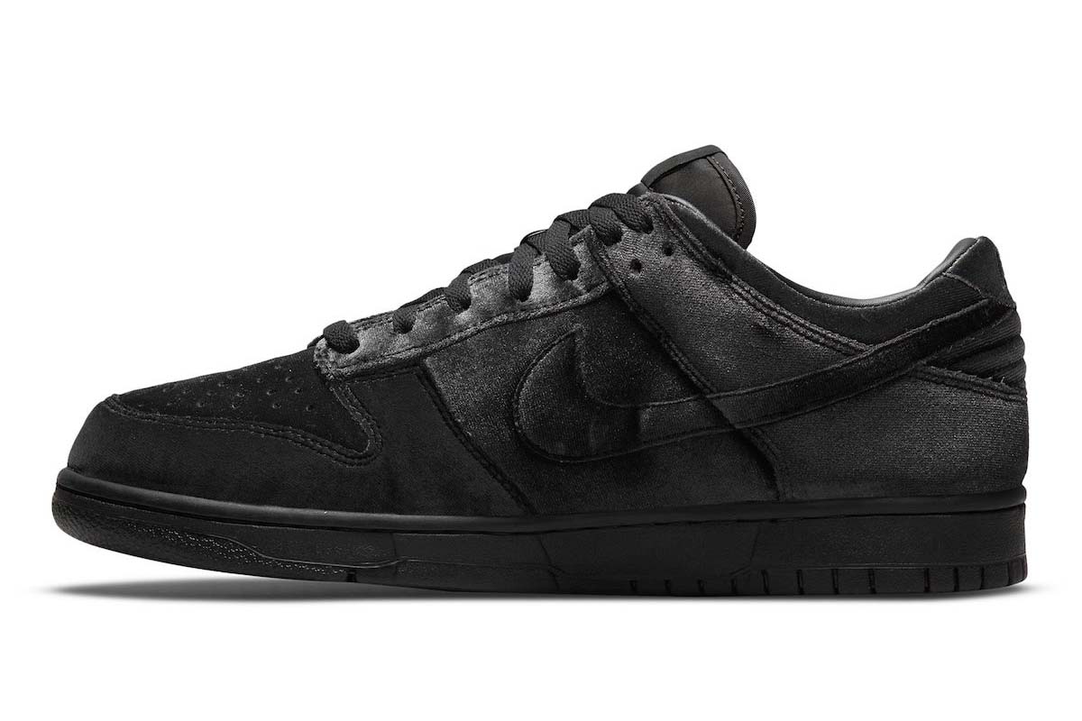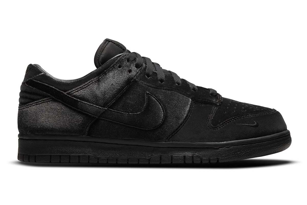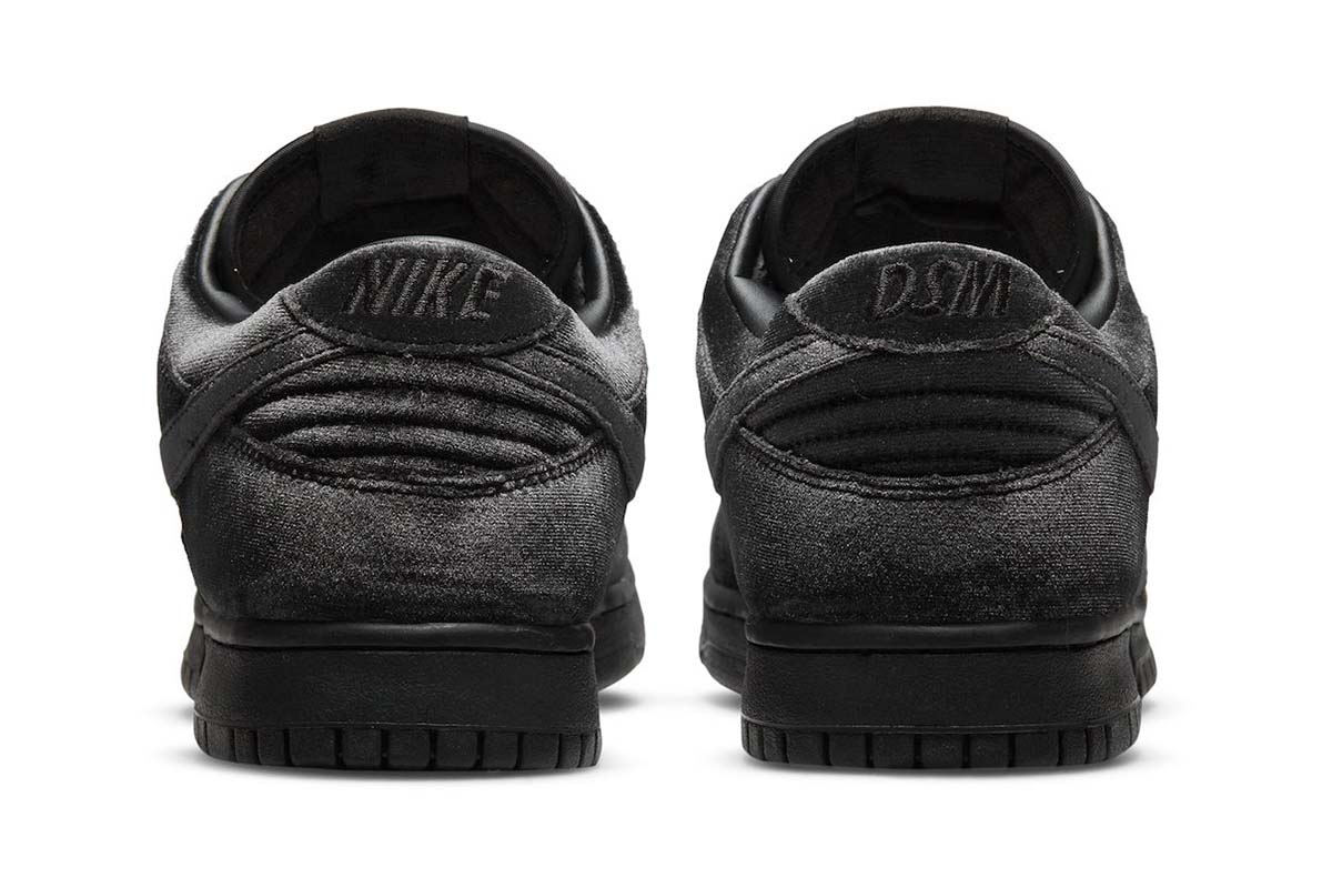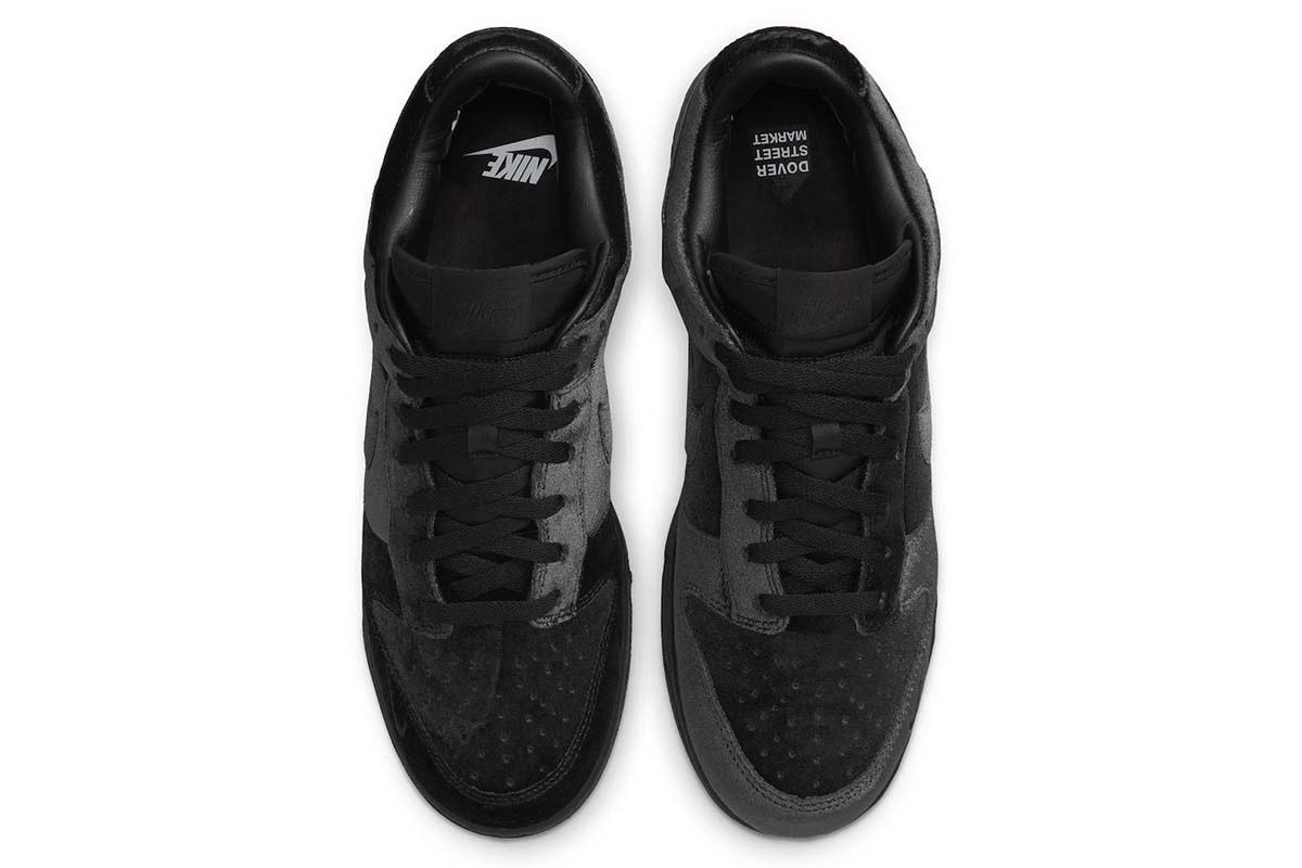 In keeping with the retailer’s monochrome aesthetic, the Dover Street Market x Nike Dunk Low ‘Black Velvet’ features a one-note finish devoid of color.