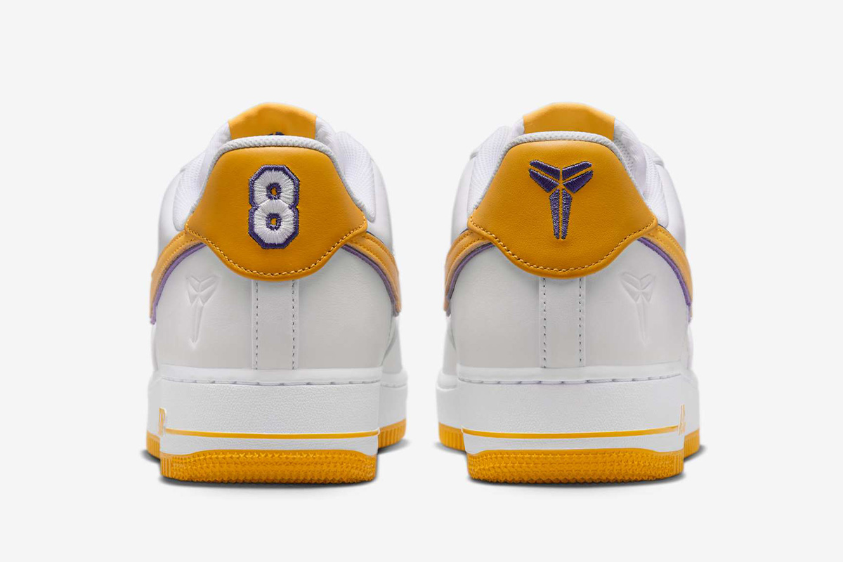 The Kobe Bryant x Nike Air Force 1 Low Retro QS ‘Lakers Home’ sports a white leather upper, accented with a Varsity Maize Swoosh outlined in purple trim. The rich yellow hue makes repeat appearances on the woven Nike tongue tag and leather back tab, featuring an embroidered ‘8’ on the left shoe and Kobe’s shield logo on the right. The latter insignia is also debossed on the lateral heel of each shoe.