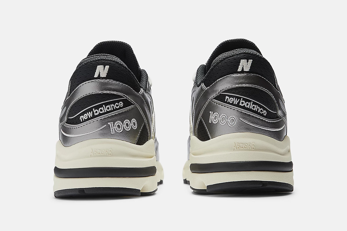 The New Balance 1000 ‘Silver Metallic’ revives a running shoe originally released in 1999. Laces feed through webbing eyelets to secure the upper, featuring a black mesh base with sweeping synthetic overlays in metallic silver. A black ‘N’ logo graces the quarter panel, while ‘1000’ is embroidered on the lateral forefoot. The sneaker rests on a dual-density C-CAP midsole, treated to a cream-colored finish and fitted with ABZORB cushioning in the forefoot and heel.