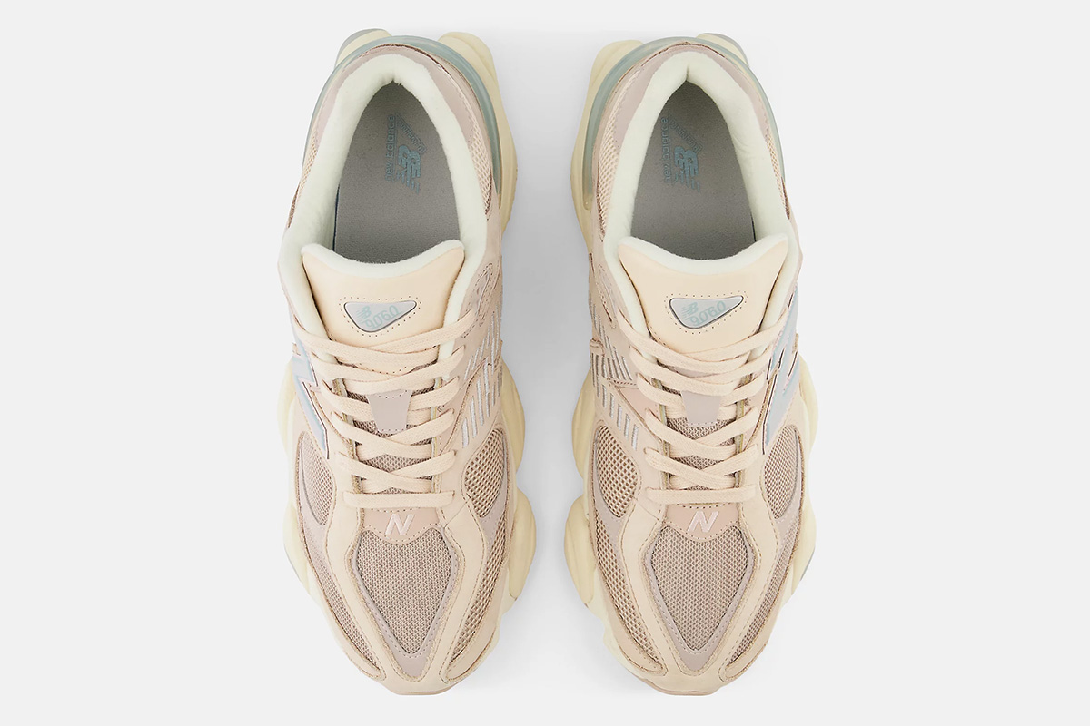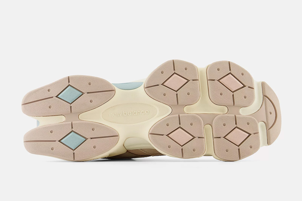 The New Balance 9060 Ivory Cream Pink Sand upper is made of a meshed undercover with suede and fabricated reflective overlays.