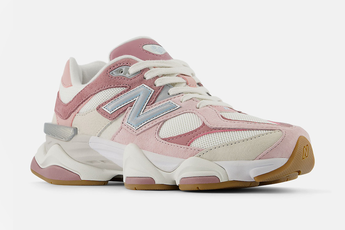 The New Balance 9060 Rose Pink is a sneaker whose design was inspired by New Balance’s 99X models, but with a more futuristic look. This version of the New Balance 9060 is made with a mesh and suede upper. White mesh makes up the base, while shades of pale, light, and darker pink adorn the suede overlays that cross the midsole, toebox, and heel. The New Balance “N” appears on both midsoles just under the laces, on one side in gray, and on the other side in dashed white lines. The midsole is made of ABZORB cushioning. Other branding elements can be found at the bottom of the laces, on the tongue, on the heel, and stamped onto the toe portion of the rubber outsole. The heel is supported by a silver panel and the chunky outsole appears in white and pink.