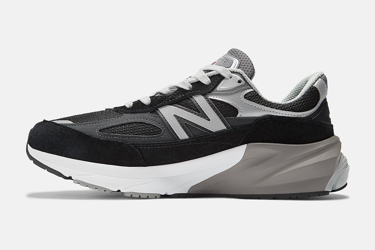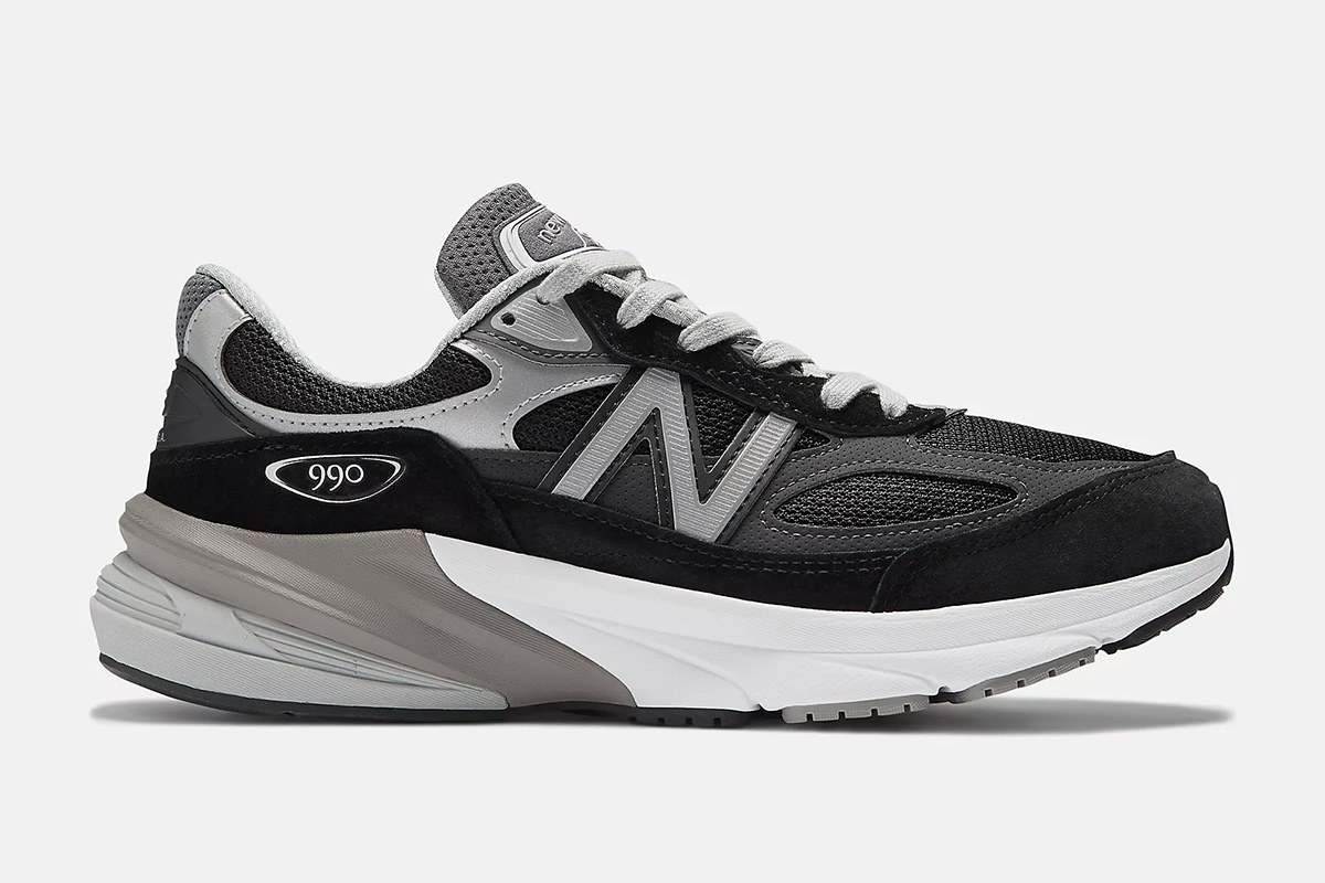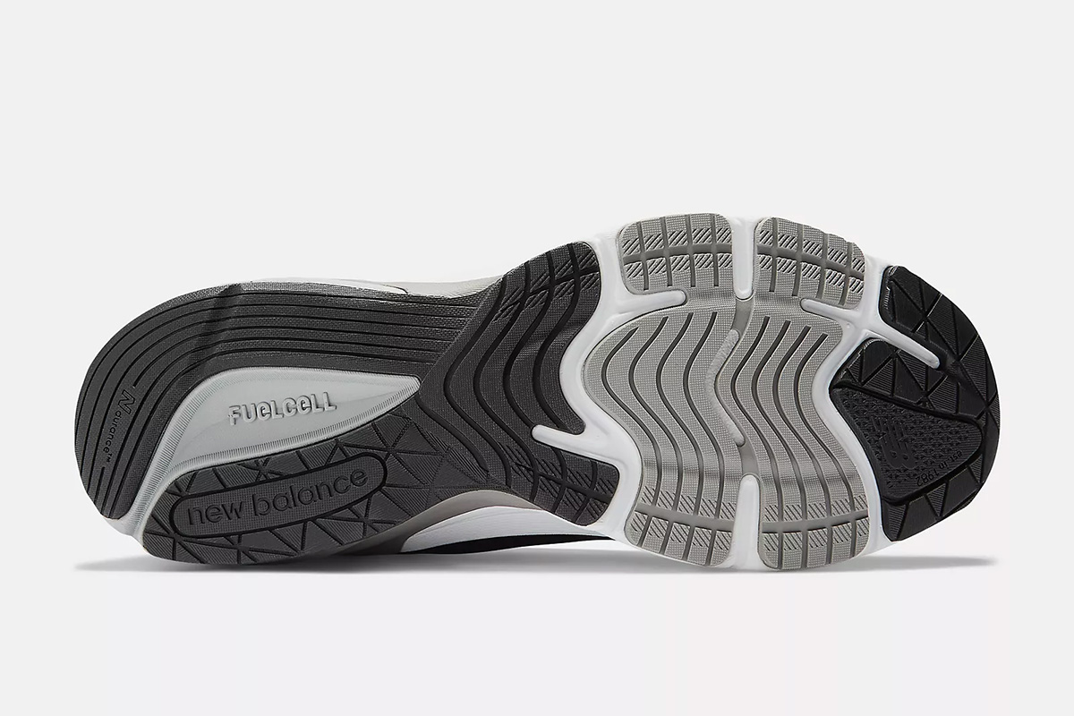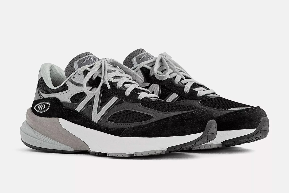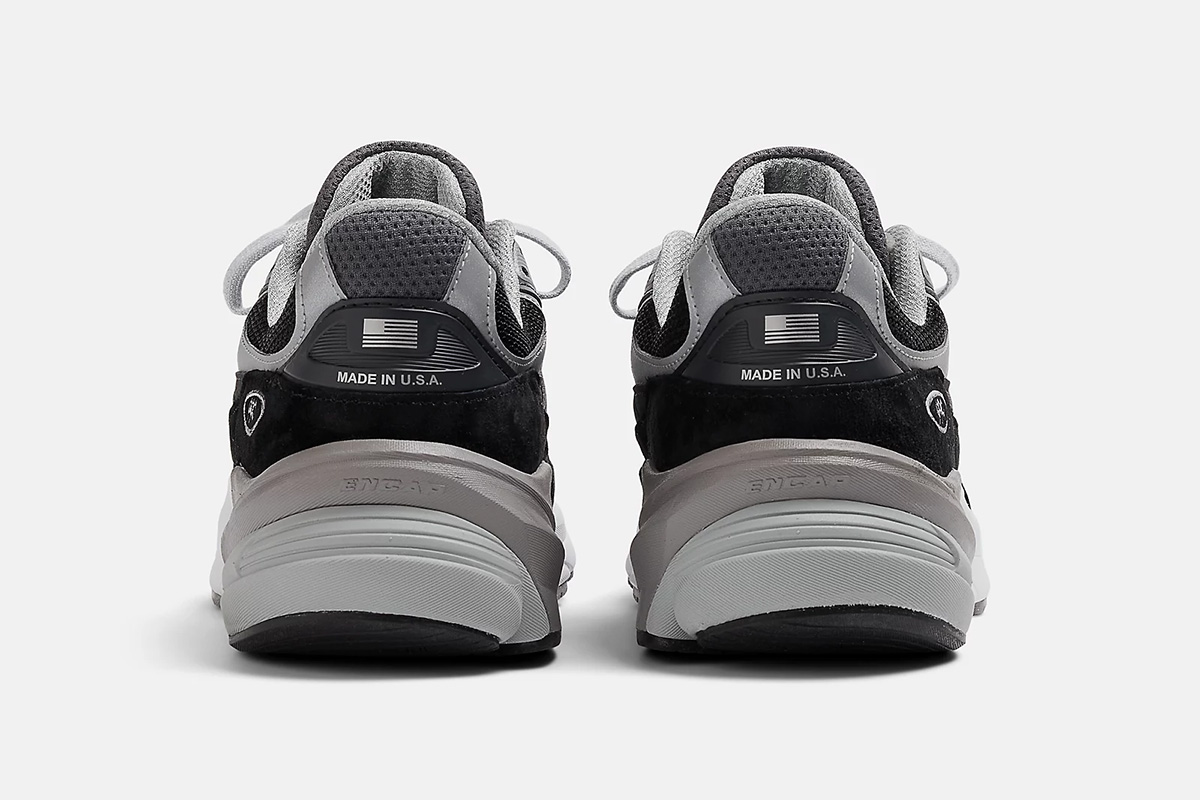 The New Balance 990v6 MiUSA Black Grey White continues to deliver the original New Balance 990 goal of a perfect running shoe by combining FuelCell technology on the midsole and a fabric lining in grey tones. The body of the New Balance 990v6 has a mesh underlay in a black hue. A dark suede overlay starts on the mudguard and proceeds to cover the circumference of the border between the shoe and the sole. On the quarter panels, a mix of mesh base, black suede, grey synthetic strips, and the “N” New Balance branding in light grey are present. A similar overlay design appears on the heel.