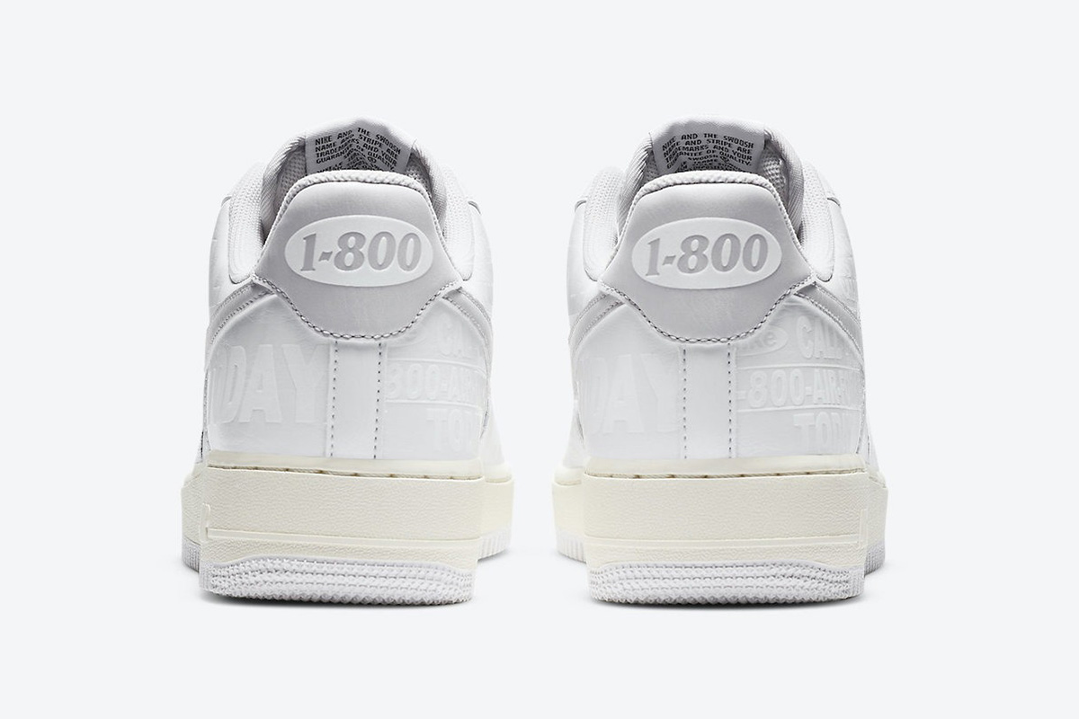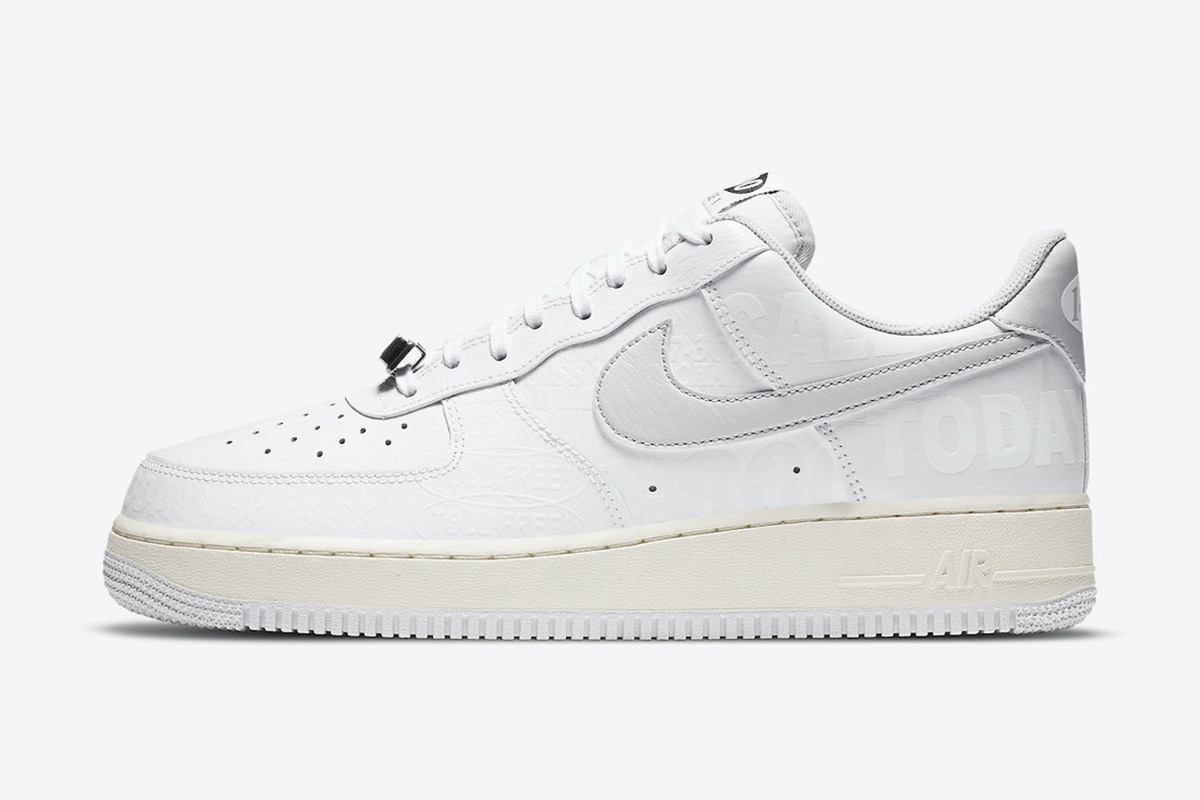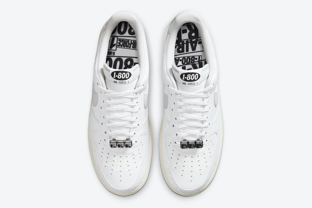The Nike Air Force 1 1-800 is subtle in color but bold in graphics. Phrases like “Toll-Free” and “Call Now” are laminated throughout the sneaker’s upper in glossy white print, camouflaging into the all-white leather.