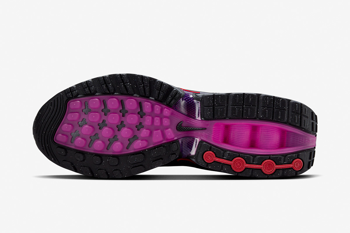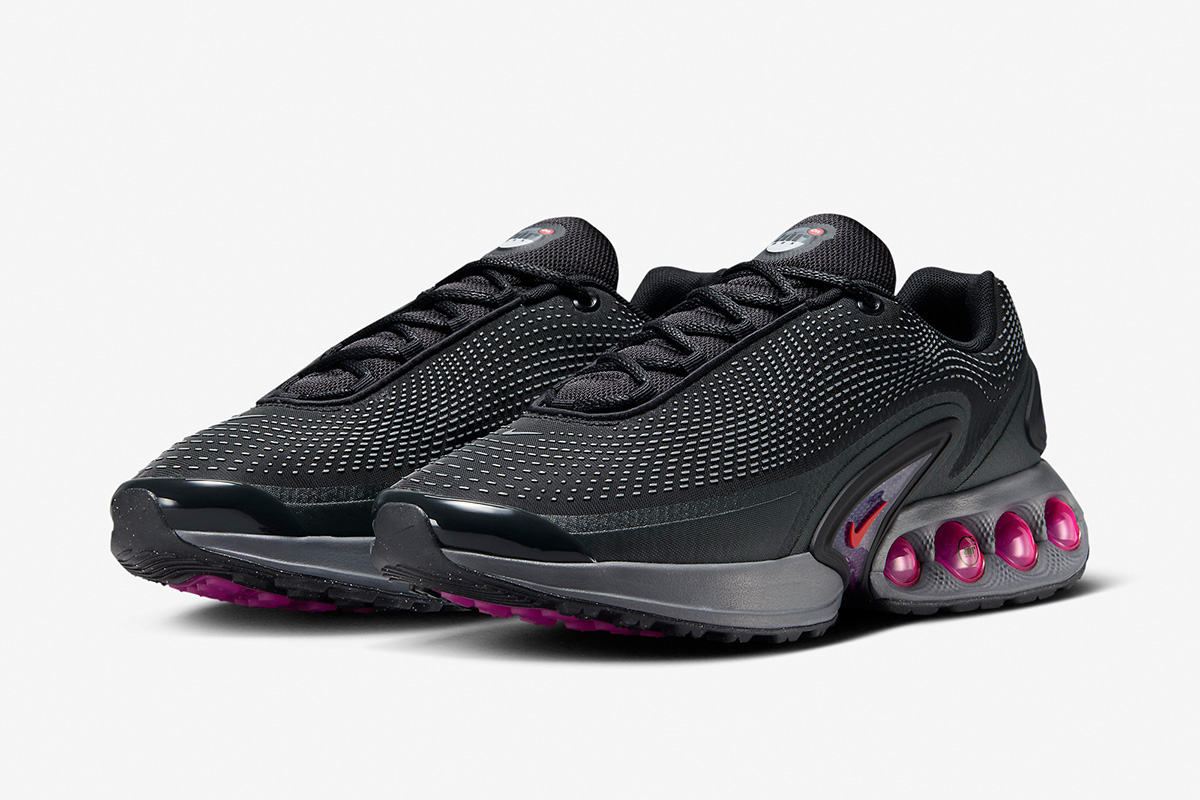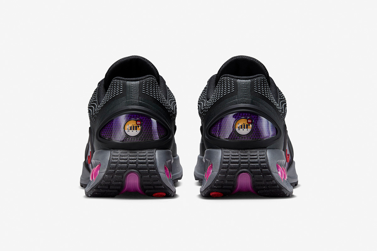 The Nike Air Max DN ‘All Night’ showcases a grey injected Phylon midsole with a pink-tinged Dynamic Air system — a dual-chamber, four-tubed Nike Air unit nestled in the heel. With each step, air flows freely between the tubes in each chamber, delivering a smooth transition and a comfortable ride. Black textile is utilized on the upper, featuring a haptic textured overlay and a TPU heel counter. The latter is marked with a circular DN Air Max badge.