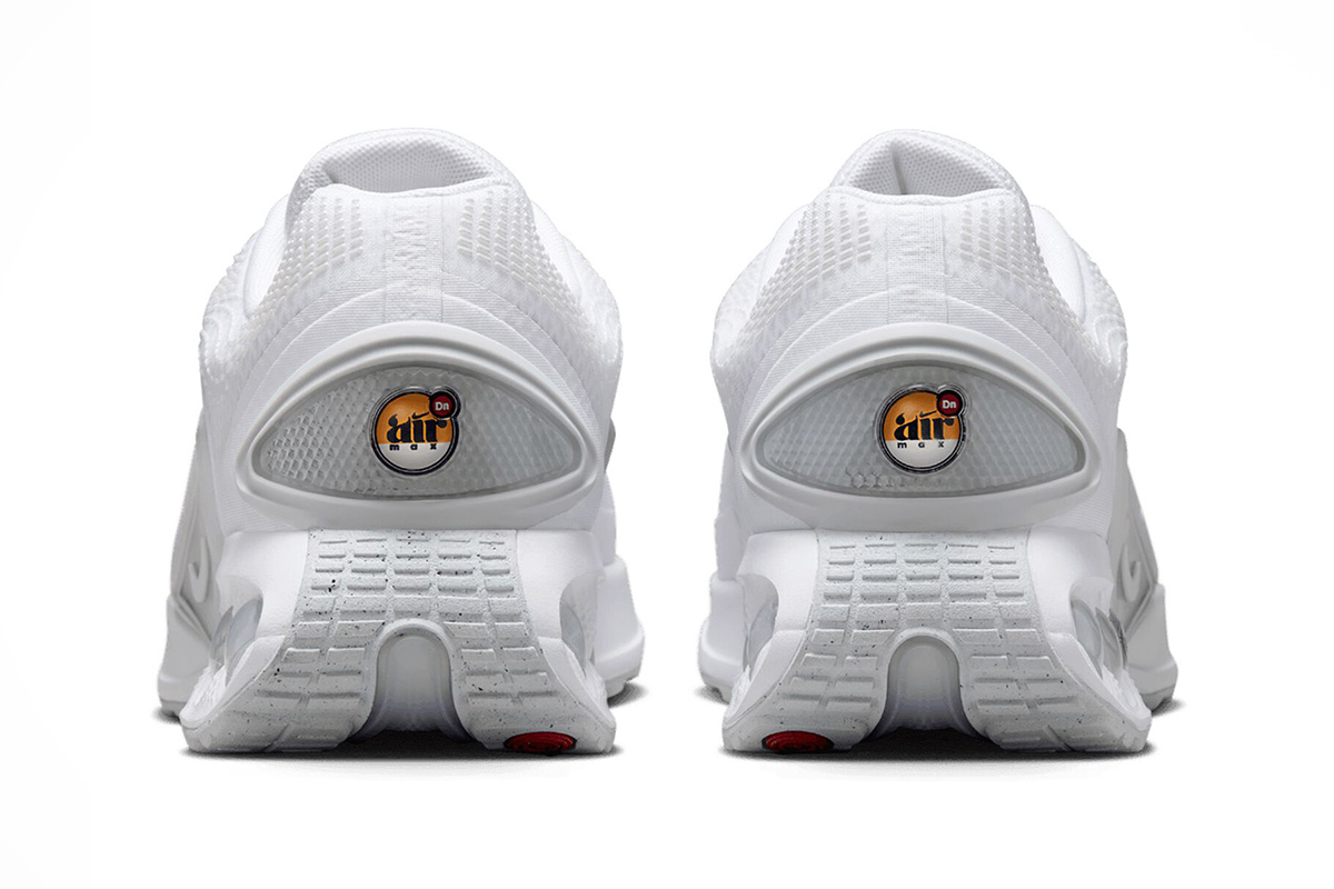 The White Metallic Silver Nike Air Max Dn has an upper made of white mesh for breathability. A raised haptic pattern appears in curves across the upper, giving it a textured look. A small Nike Swoosh sits at the bottom of the laces on top of the toebox. White film forms the mudguard, which rounds out the shoe, and the arches are supported and bear small white Nike Swooshes. The gray heel area has Air Max Dn branding, as does the tongue. The shoe sits on a white midsole, and under the heel you can find four transparent Air Max Dn tubes for support and cushioning. The outsole is gray.Â