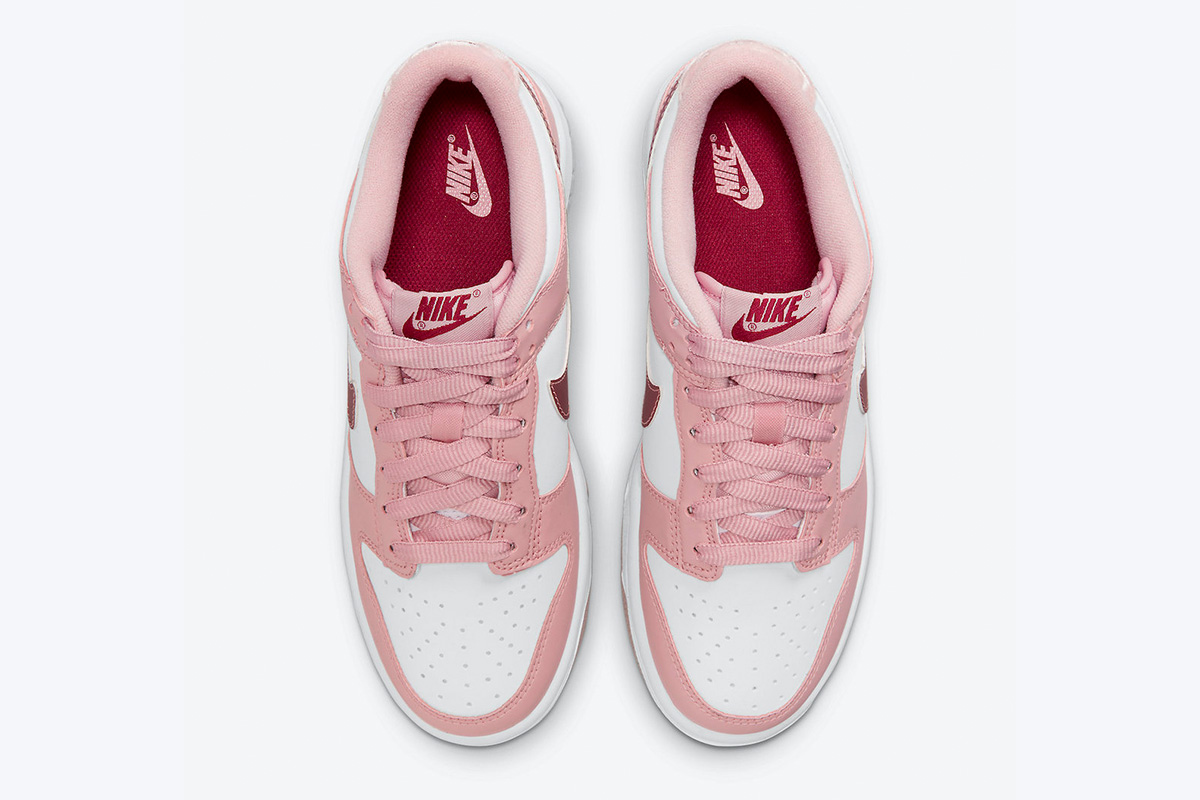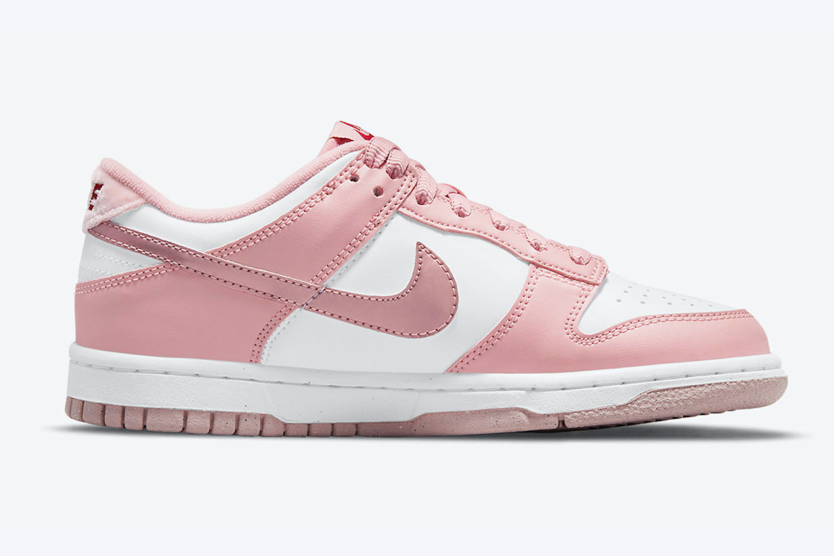 Built for big kids, the Nike Dunk Low GS ‘Pink Velvet’ carries a leather upper that pairs a clean white base with soft pink overlays.
