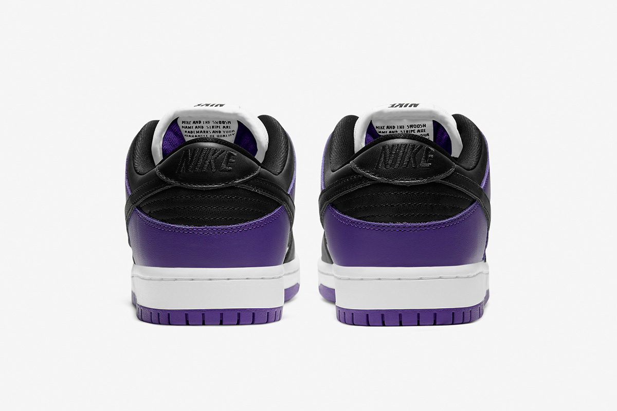 The Nike Dunk Low SB ‘Court Purple’ delivers a straightforward colorway of the classic silhouette, redolent of the brand’s pink and silver box eras. The low-top makes use of a white leather upper with contrasting black overlays on the forefoot, eyestay and collar. A heel overlay in Court Purple is matched by the rubber outsole, featuring a grippy traction pattern originally designed for the hardwood. Zoom Air cushioning in the sockliner combines with a stuffed tongue to provide enhanced comfort.