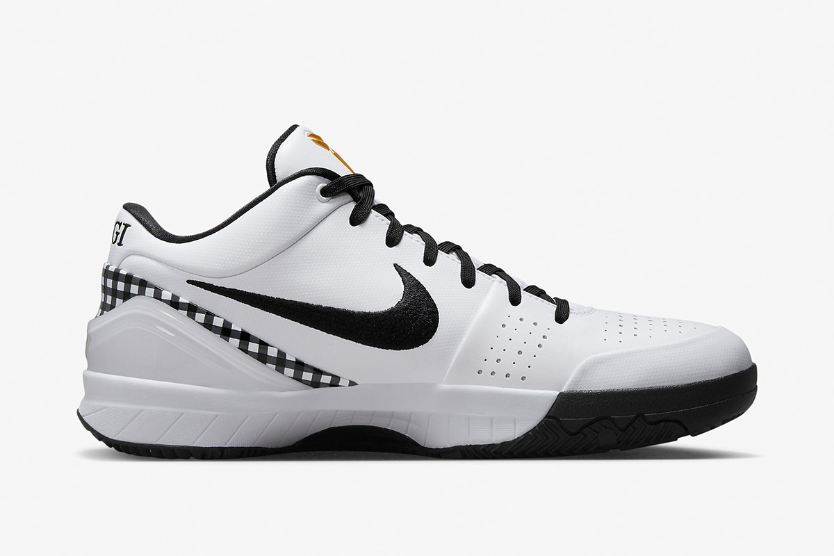 Dressed in the signature colors of Team Mamba, Gigi’s AAU squad, the white synthetic leather upper is accented with a contrasting black Swoosh, a decorative black-on-white grid pattern on the heel overlay, and a ‘Gigi’ wordmark embroidered on the back tab.
