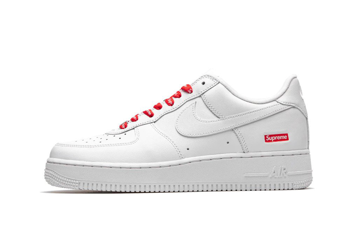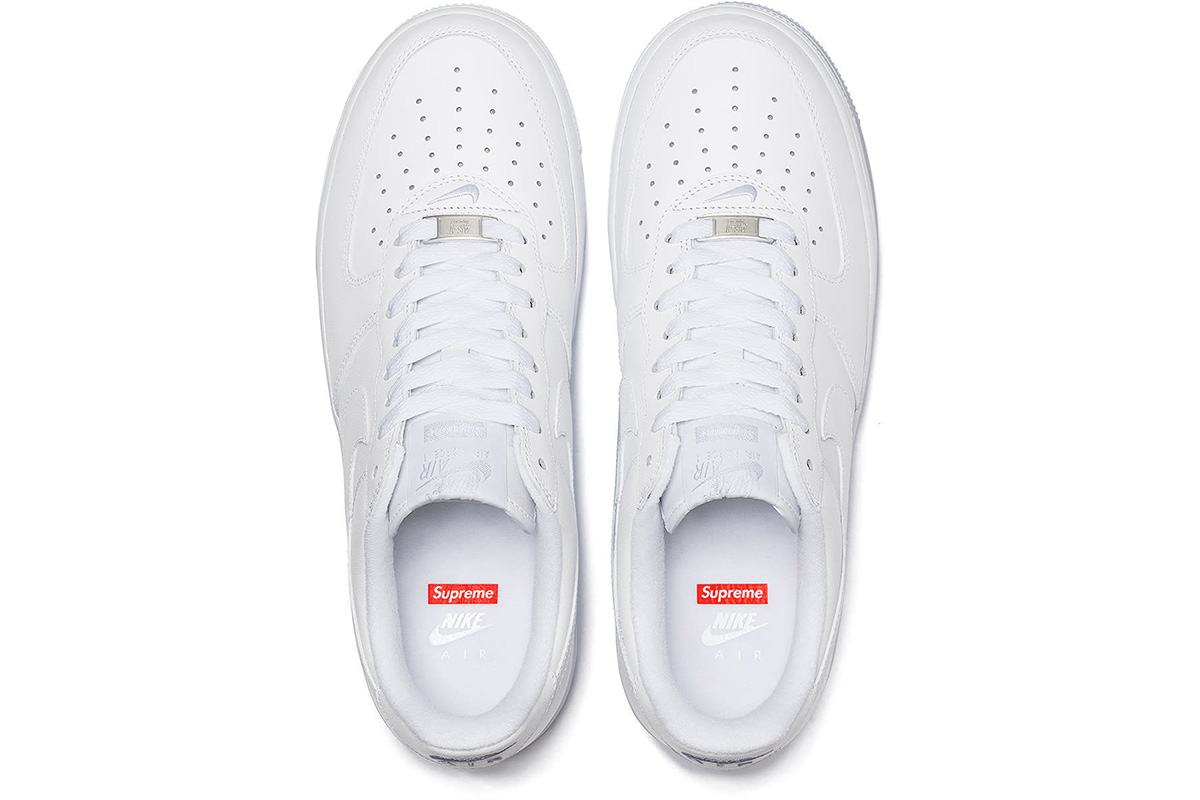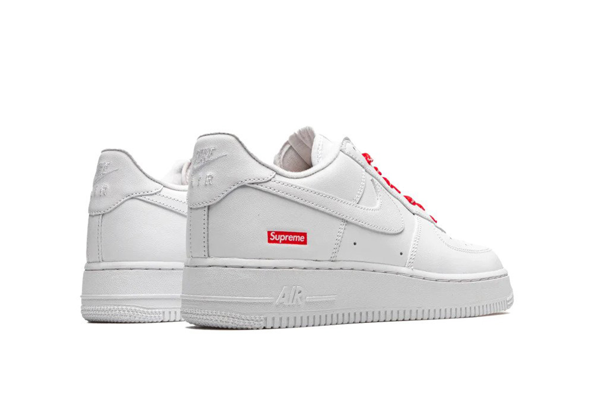 The low-top features an upper crafted from full-grain leather in a monochromatic white finish, accented with Supreme’s signature red box logo on the lateral heel.