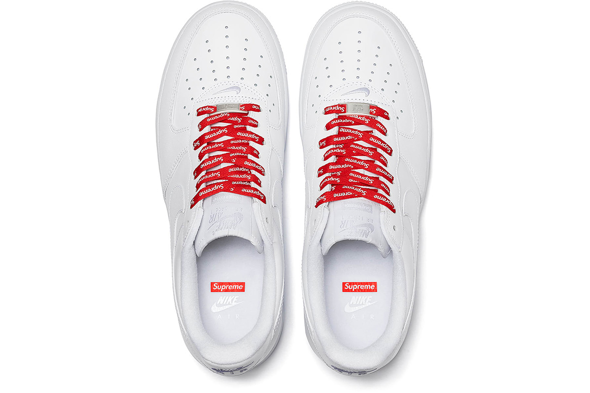 Additional Supreme branding hits appear on the custom sockliner and a secondary set of red laces.