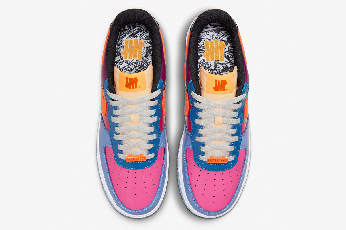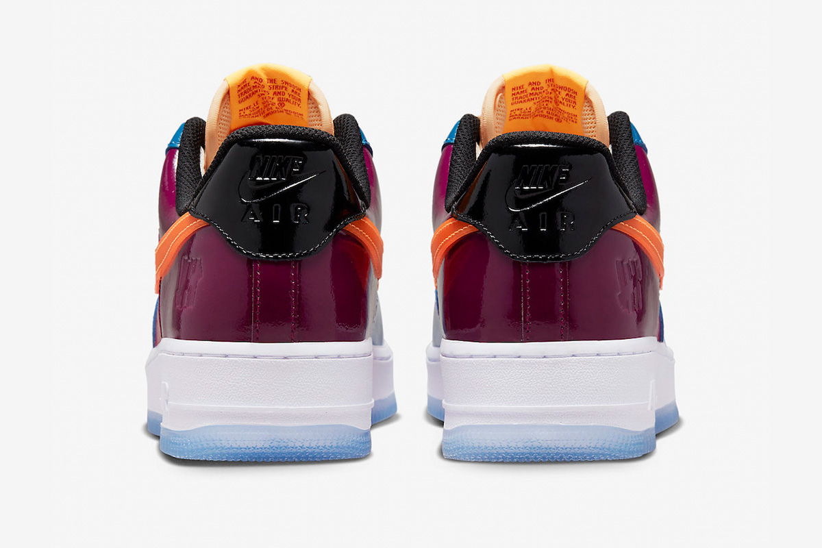 The Undefeated x Nike Air Force 1 Low ‘Total Orange’ delivers an eye-catching design highlighted by clashing hues and a glossy exterior. Built with shiny patent leather, the paneled upper is finished in an eclectic mix of blue, fuchsia, crimson, purple and black. In addition to a stitched orange Swoosh, branding elements include UNDFTD lace dubrae and a debossed Nike Air logo on the heel tab. Undefeated’s Five Strikes graphic appears on the lateral heel and woven tongue tag. The low-top is mounted on a crisp white midsole, fitted with encapsulated Air-sole cushioning and supported by a translucent rubber outsole.