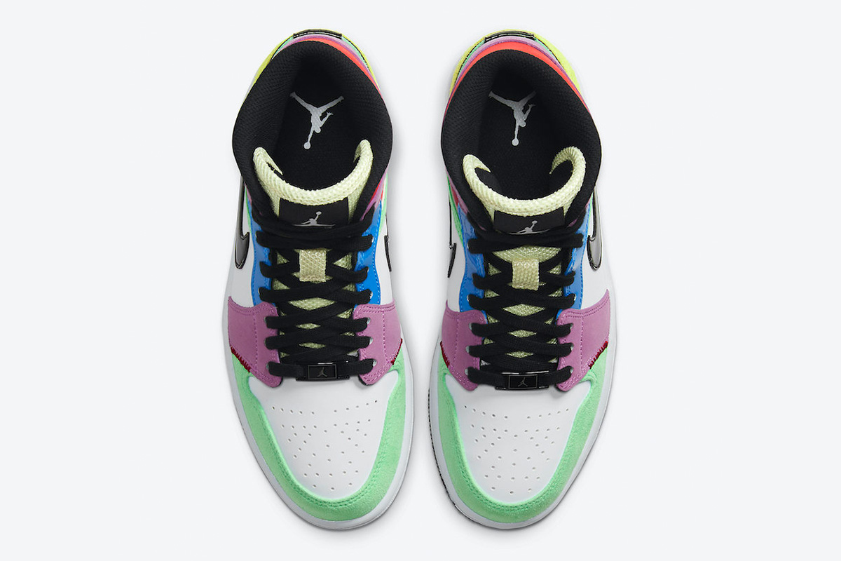 The women’s Air Jordan 1 Mid SE ‘Lightbulb’ showcases an array of mixed materials and hues on the upper.