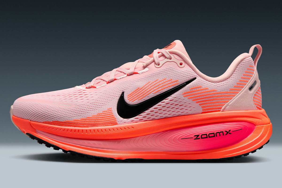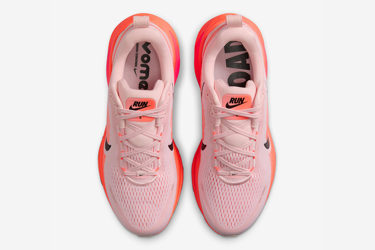 The Nike Women’s Vomero 18 ‘Atmosphere Pink’ introduces the launch colorway of the performance running shoe, featuring a pink engineered mesh upper with a molded black Swoosh and reflective detailing on the external heel counter. The cushioning setup takes the form of a rocker-shaped midsole that houses ZoomX foam in a ReactX foam carrier. Underfoot, the high-abrasion rubber outsole utilizes a podular design for improved traction and flexibility.